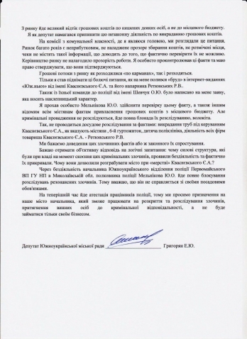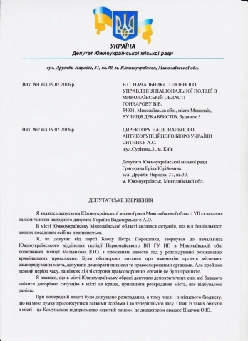 Депутат Южноукраинского горсовета Эрик Григорян направил обращение на имя исполняющего обязанности начальника Главного управления Национальной полиции в Николаевской области Виталия Гончарова, а также на имя директора Национального антикоррупционного бюро Украины Артема Сытника с просьбой обратить внимание на расследование резонансных уголовных дел в городе. В частности, депутат просит разобраться, почему блокируется уголовное разбирательство по фактам растраты бюджетных средств, связанных с деятельностью коммунального рынка.