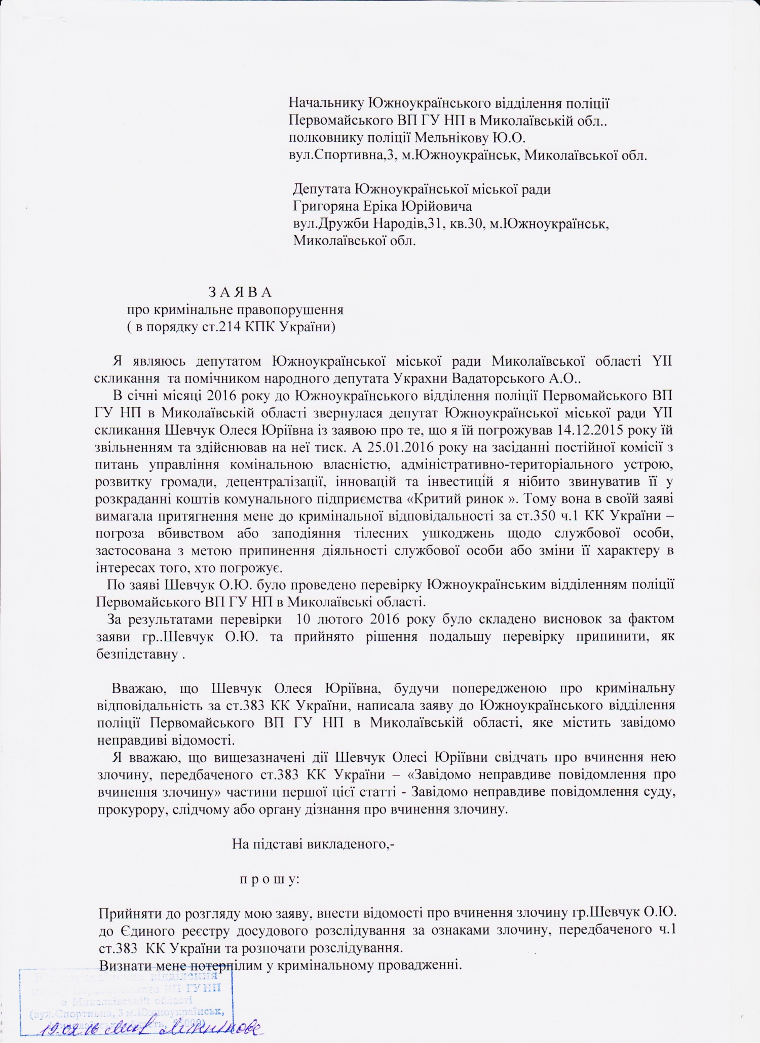 – Считаю, что Шевчук Олеся Юрьевна, будучи предупрежденной об уголовной ответственности, написала заявление в Южноукраинский отдел полиции, которое содержит заведомо неправдивые сведения. Я считаю, что вышеупомянутые действия свидетельствуют о совершении ею преступления, предусмотренного статьей 383 Уголовного кодекса Украины – «Заведомо неправдивое сообщение о совершение преступления», – сказано в тексте заявления.