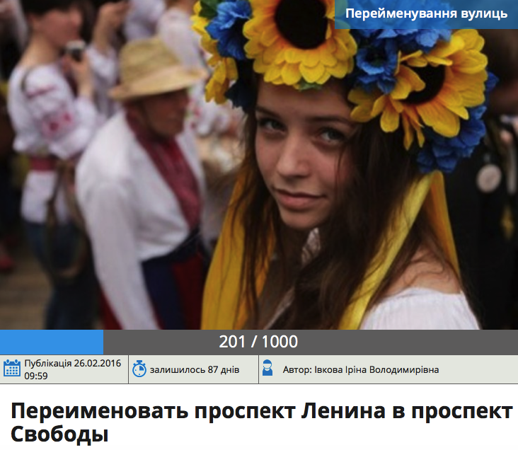 Последняя петиция касается бывшего проспекта Ленина, который распоряжением мэра Николаева был переименован в «Центральный». Автор петиции Ирина Ивкова предлагает назвать улицу проспектом Свободы.
