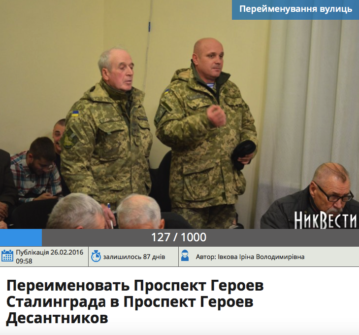 Кроме того, также появилась петиция о переименовании проспекта Героев Сталинграда в проспект Героев Десантников. Автором обращения, которое набрало уже больше 100 голосов, стала Ирина Ивкова.