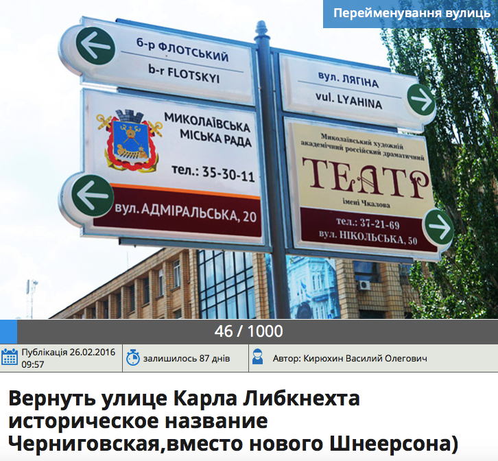 «Черниговская это старое название улицы Карла Либкнехта. Не все николаевцы правильно произносят улицу Карла Либкнехта, а тем более пишут, а новое название Шнеерсона, вообще не запомнят. Черниговская - простое, всем понятное название для этой улицы.Тем более, что многие жители еще помнят ее старое, историческое название и привыкнуть к нему не составит труда», – убежден автор петиции.