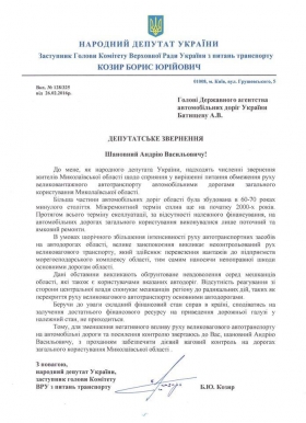Народный депутат Борис Козырь обратился к главе государственного агентства автомобильных дорог Украины Андрею Батищеву с просьбой обеспечить работу весового контроля на дорогах общего пользования Николаевской области.