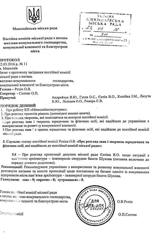 Члены постоянной депутатской комиссии единогласно поддержали предложение депутата Владислава Ентина о передаче на баланс коммунального предприятия «Николаевводоканал» водонапорной башни – известной как «башня Шухова».