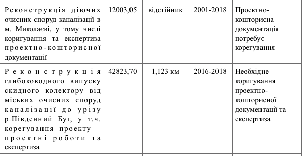 Указывается, что для реконструкции действующих очистных сооружений канализации в Николаеве, в том числе корректировки и экспертизы проектно-сметной документации, необходимо 12 миллионов 3 тысячи гривен. Согласно данным документа, проект по ремонту очистных сооружений был начат еще в 2001 году, его планируют закончить в 2018 году.