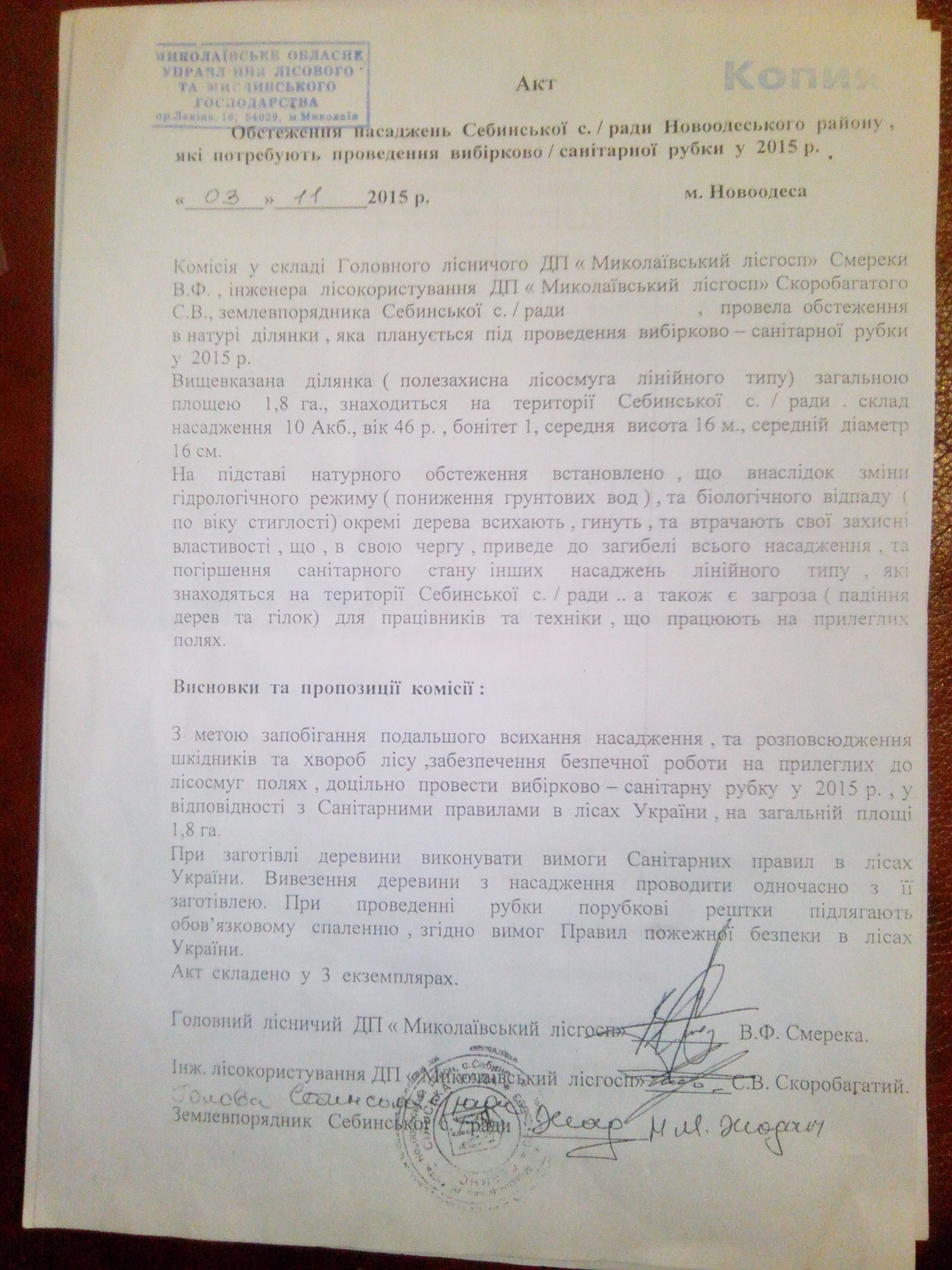 - От имени главы сельсовета ставила свою подпись и закрепляла ее печатью «уже» 3. ноября 2015. Именно этой датой, за неделю до вступления в должность, датирован акт обследования насаждений на территории Себинского сельского совета, где на месте подписи землеустроителя стоит подпись Натальи Жадан. 3 ноября в селе Себино Жадан еще не была сельським главой, а работала (согласно ее трудовой) директором Себинского дома культуры. 3 ноября обязанности главы Себинского сельсовета исполняла бывший секретарь сельсовета Ковынева, которая была уволена решением сессии 9 ноября 2015. Она же отвечала за сохранность печати, в пользование Жадан ее не передавала, - рассказала Наталья Ковальчук.
