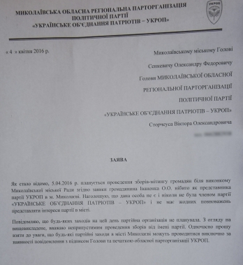 - …считаю недопустимым проведение собраний от имени партии. В то же время прошу принять во внимание, что какие-либо партийные мероприятия в городе Николаеве могут проводить исключительно при наличии сообщения с подписью главы и печатью областной партогранизации «УРОП», - говорится в письме.