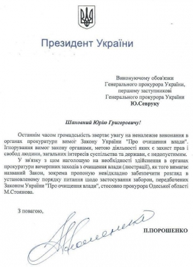 — Президент написал исполняющему обязанности Генпрокурора Ю.Севруку письмо о неотложной необходимости уволить прокурора Одесской Н.Стоянова в порядке люстрации. Он обратил внимание на ненадлежащее исполнение в органах прокуратуры требований закона «Об очищении власти», - указал пресс-секретарь президента Святослав Цеголко.