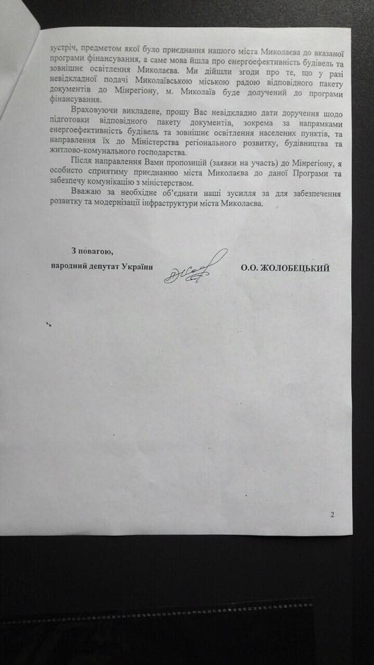 Об этом говорится в тексте депутатского обращения народного депутата Украины Александра Жолобецкого на имя городского головы Николаева Александра Сенкевича. Копию документа опубликовал на своей странице в Facebook депутат Николаевского горсовета Вячеслав Апанасенко.
