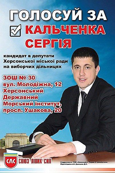 Житель города Херсона Сергей Кальченко, который вместе со своим братом Дмитрием вчера напали на журналистов «Преступности.НЕТ», в 2010 году баллотировался в депутаты Херсонского городского совета от пророссийской партии «Союз левых сил», будучи членом данной политсилы.