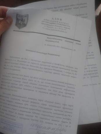 Активисты гражданского корпуса полка «Азов» призвали Николаевского городского голову Александра Сенкевича вмешаться в конфликтную ситуацию, которая возникла из-за возможного продления аренды помещения общественной организации «Центр русской культуры» по улице Адмирала Макарова, 7. Данную организацию возглавляет активная участница пророссийских митингов в Николаеве и бывший лидер запрещенного «Русского блока» Евгения Бондаренко.