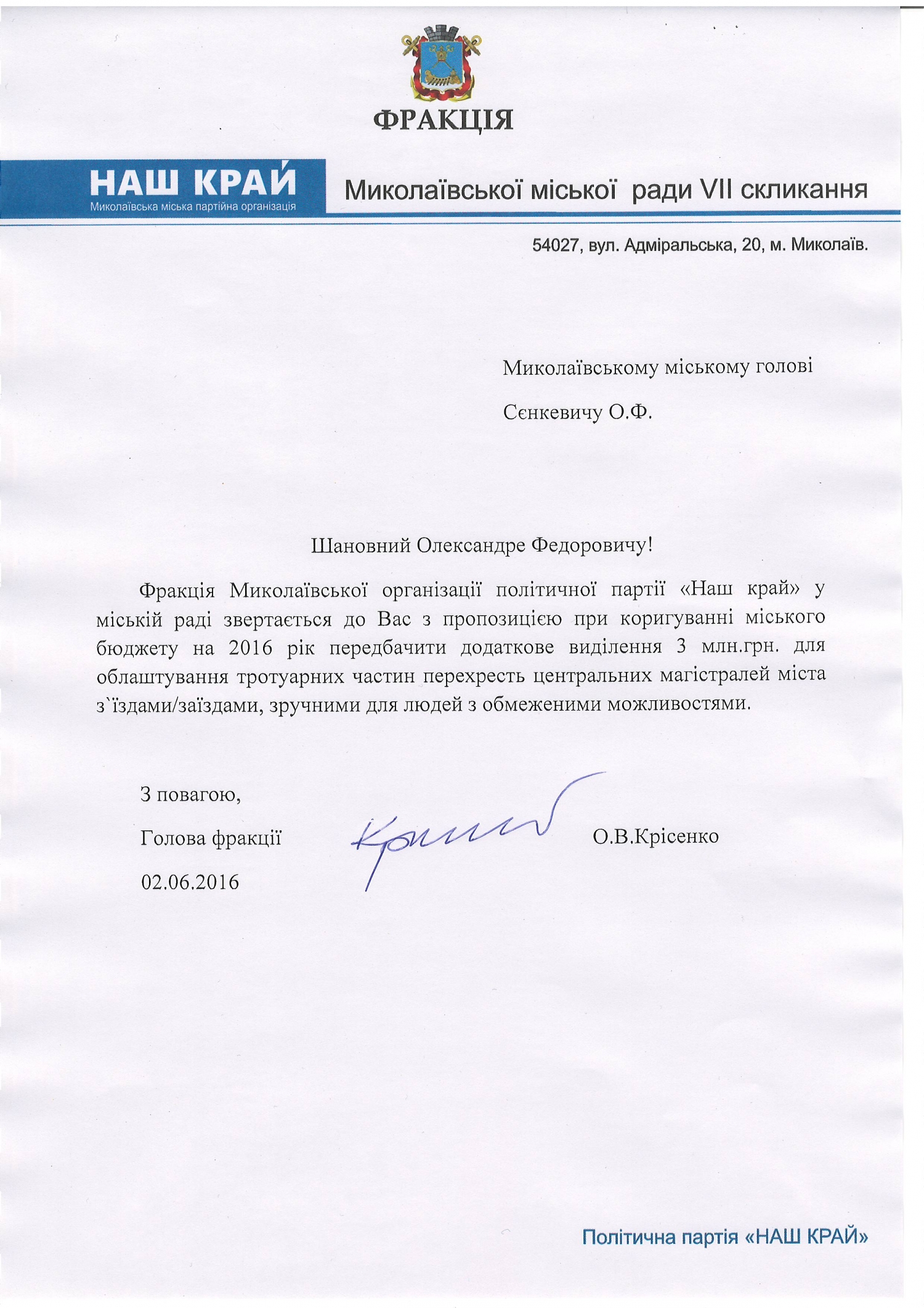 На заседании фракции партии «Наш край» Николаевского городского совета депутаты приняли решение обратиться к городскому голове города Николаева Александру Сенкевичу с предложением заняться в этом году улучшением инфраструктуры города и предусмотреть при корректировке городского бюджета на 2016 год дополнительное выделение средств для обустройства пандусов на пешеходных переходах города.