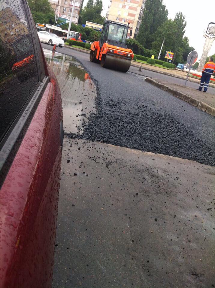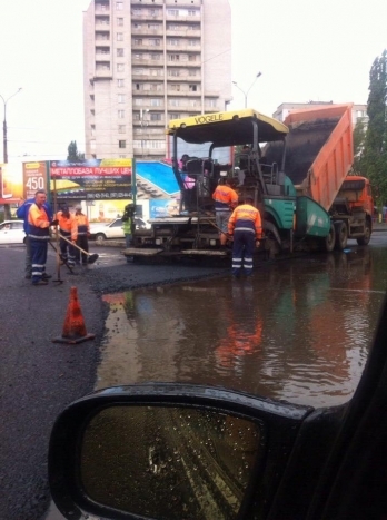 В среду, 15 июня, в Николаеве работники одесской фирмы «Дорлидер» укладывали асфальт в лужи, которые образовались после ночного ливня.