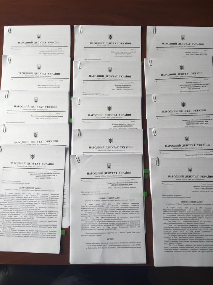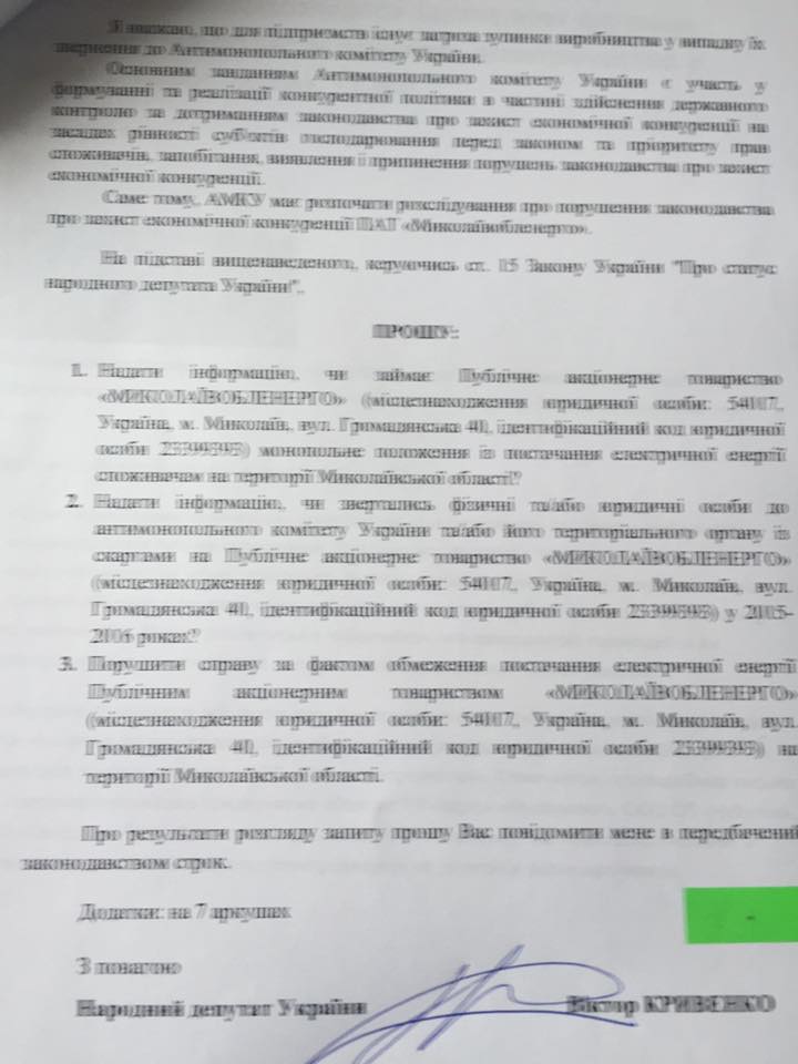 Народный депутат Украины, заместитель главы Комитета Верховной Рады по вопросам бюджета Виктор Кривенко сделал 15 депутатских запросов, в том числе и в Антимонопольный комитет Украины, с просьбой проверить законность действий ПАО «Николаевоблэнерго» по уменьшению договорной величины потребления электрической энергии крупным потребителям до 30%.