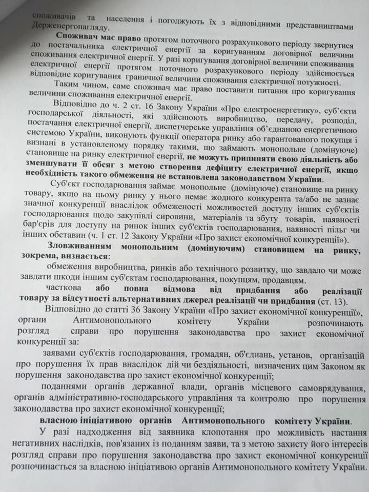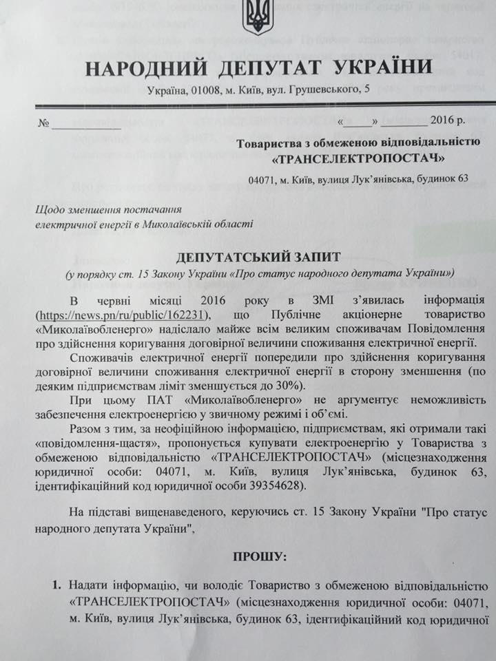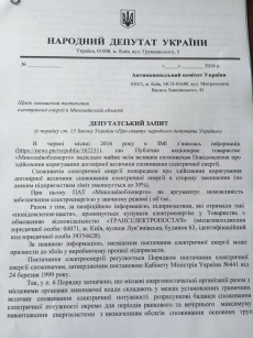 Он указывает, что есть основания считать, что облэнерго хочет всунуть посредника в поставку электроэнергии крупным потребителям, а именно киевское ООО «Трансэлектроснаб», куда он также отправил запрос.