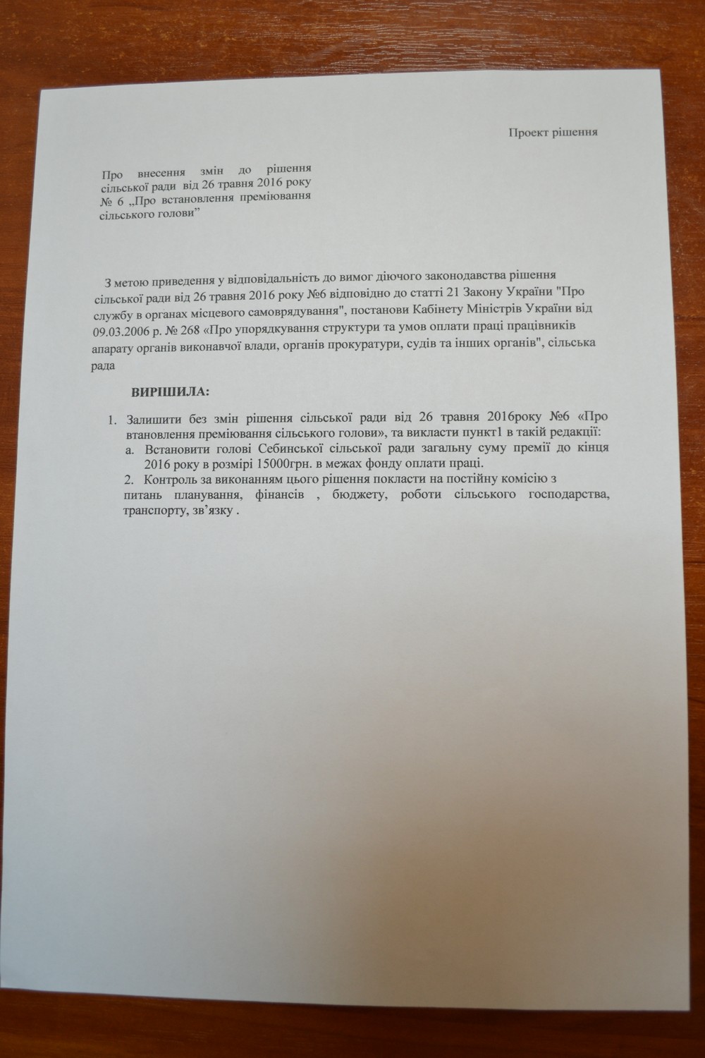 Депутаты Себинского сельсовета призвали прокуратуру проверить законность премирования Натальи Жадан в размере 15 тысяч гривен.