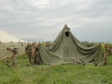 В первый день учений, сразу по приезде подразделений охраны и техники, в поле обустроили палаточный лагерь военной части: со столовой, штабом, горницей, жилыми палатками, медицинской и дежурной частью, передвижным местом хранения оружия и полевыми санузлами.