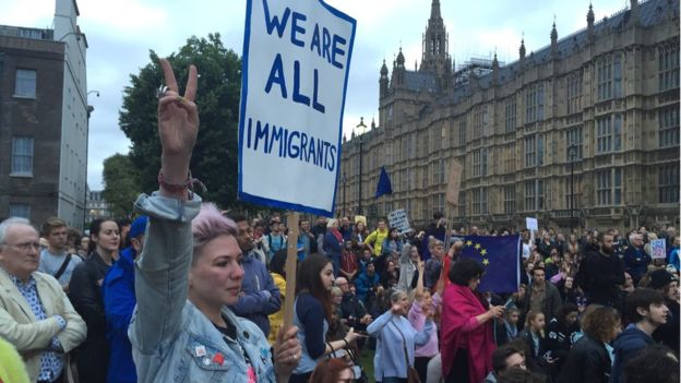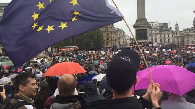 В центре Лондона во вторник прошел первый большой полустихийный митинг против выхода Британии из Евросоюза, на который собрались несколько тысяч человек. Протестующие собрались на Трафальгарской площади, а затем пошли к парламенту.