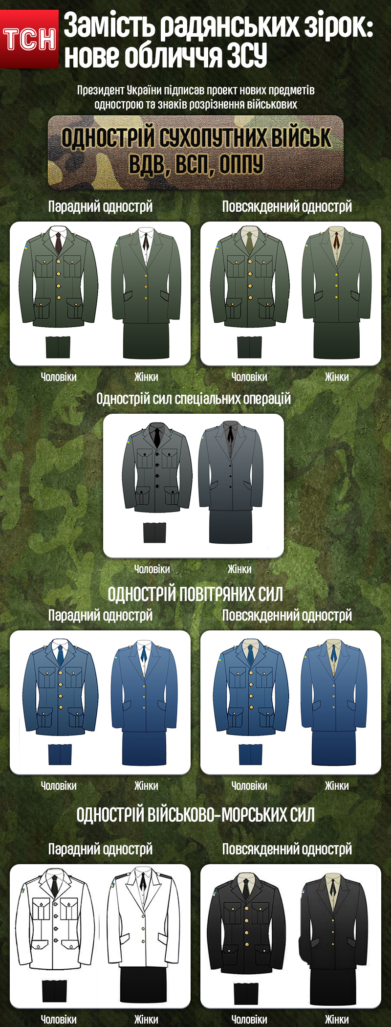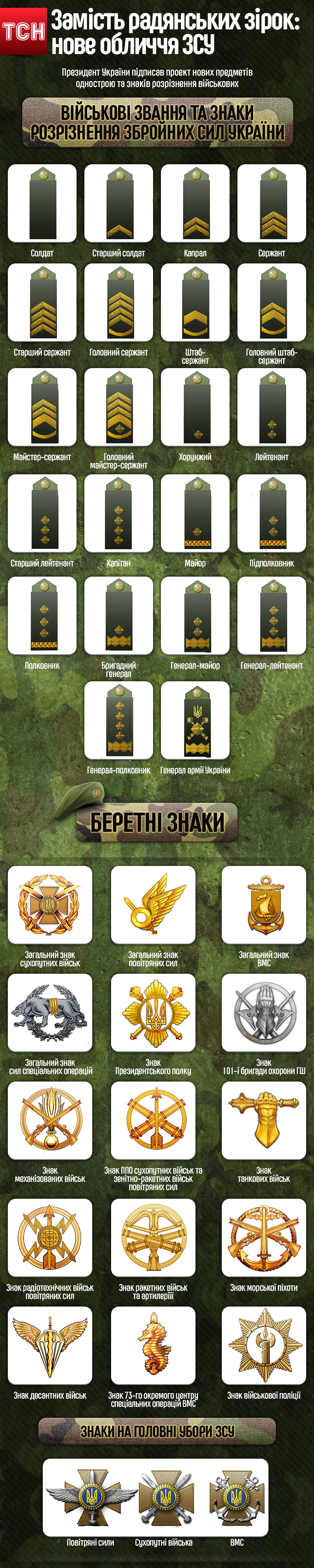 Виталий Гайдукевич, в свою очередь, выложил в Сеть концепцию новой формы. На инфографиках можно увидеть, как изменятся знаки различия и форма военных. Следует заметить, что советские звезды с погон ВСУ исчезнут.