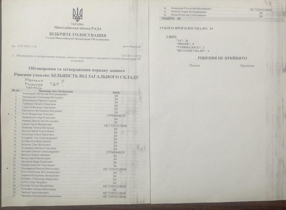 В них указано, что депутаты от «Оппозиционного блока» Станислав Мишкур, Александр Маликин и Павел Зоткин отсутствовали в зале в момент голосования. При этом, по информации НикВестей, если двое последних вышли из зала накануне голосования, то Станислав Мишкур находился в сессионном зале.