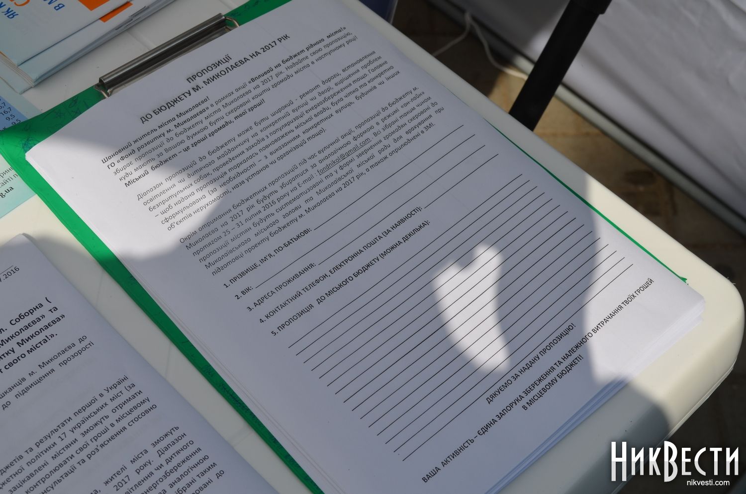 Как рассказал руководитель общественной организации, в ходе акции, которая продлится до 14:00, горожане в специальных анкетах смогут оставить свои предложения относительно формирования бюджета на 2017 год. В дальнейшем все они будут систематизированы и переданы городскому голове Николаева и бюджетной комиссии горсовета.