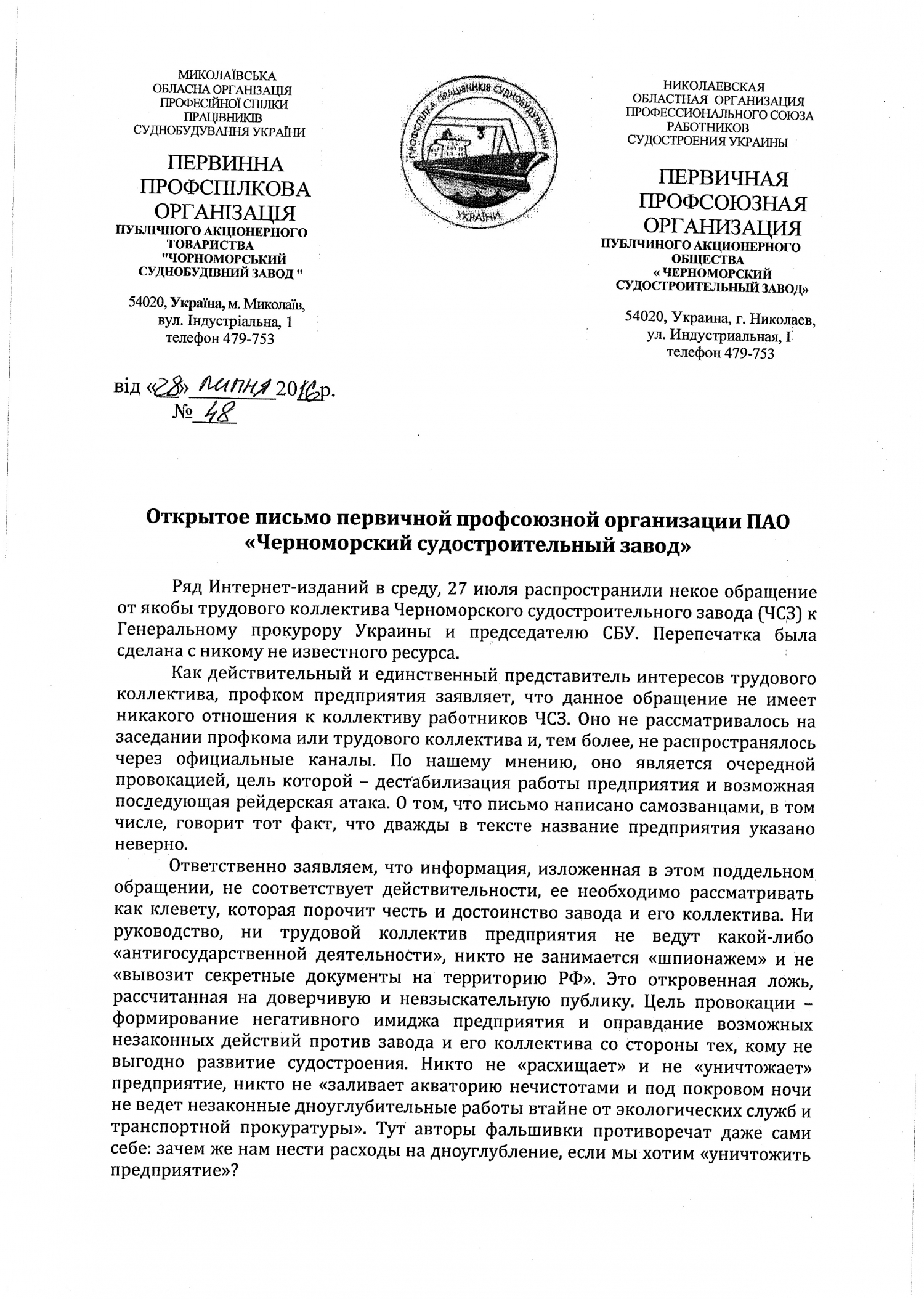 Первичная профсоюзная организация Черноморского судостроительного завода назвала фальшивкой письмо от якобы трудового коллектива предприятия на имя Генпрокурора и главы СБУ, опубликованное в среду рядом региональных интернет-изданий.