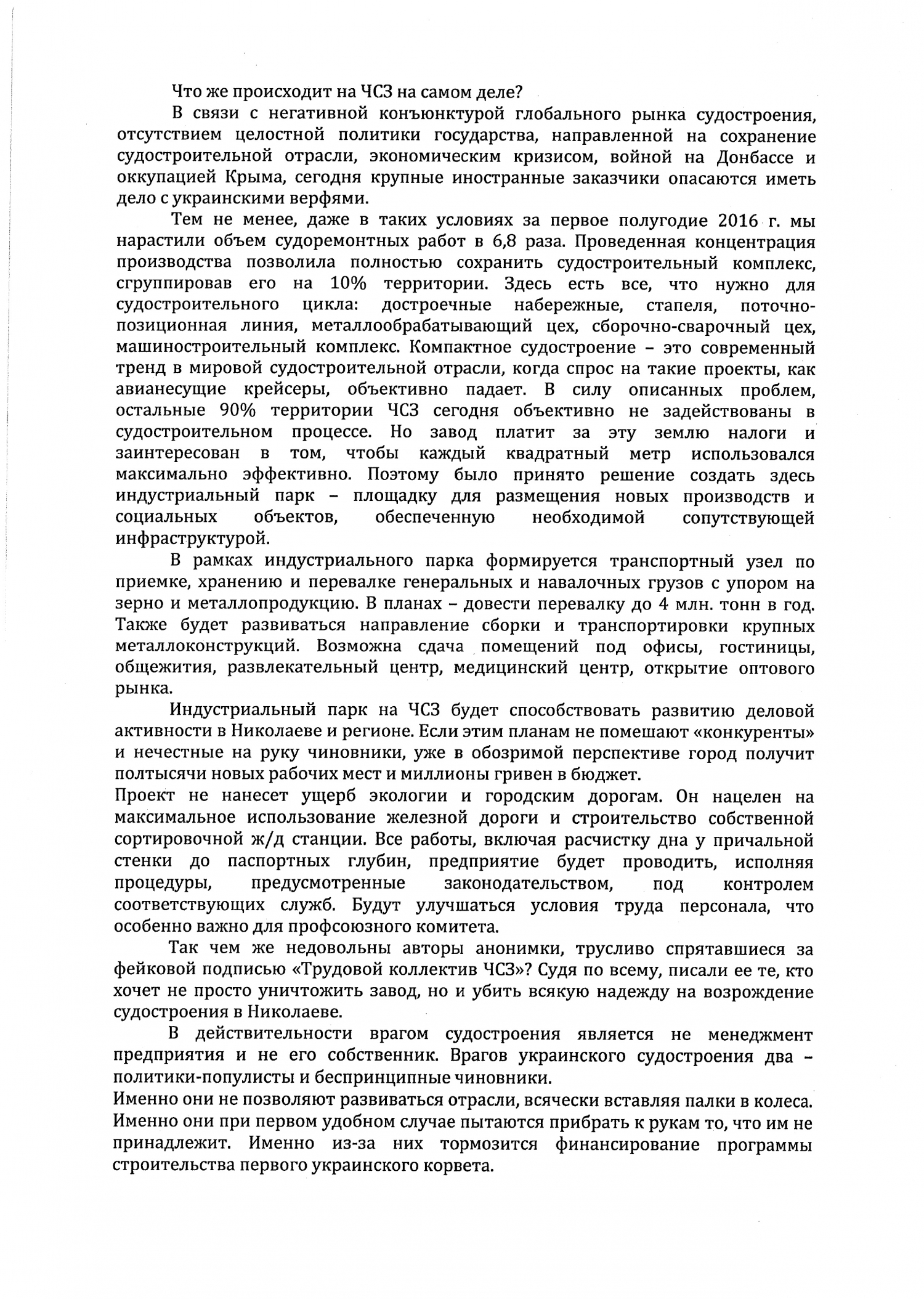 – Индустриальный парк на ЧСЗ будет способствовать развитию деловой активности в Николаеве и регионе. Если этим планам не помешают «конкуренты» и нечестные на руку чиновники, уже в обозримой перспективе город получит полтысячи новых рабочих мест и миллионы гривен в бюджет, - подчеркивается в документе.