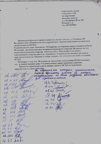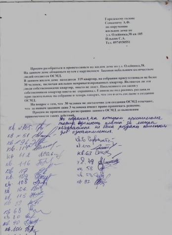 В тексте обращения говорится, что в доме создается ОСМД без уведомления большинства жильцов. На первом собрании по случаю создания объединения присутствовало 30 человек, хотя в доме 119 квартир.