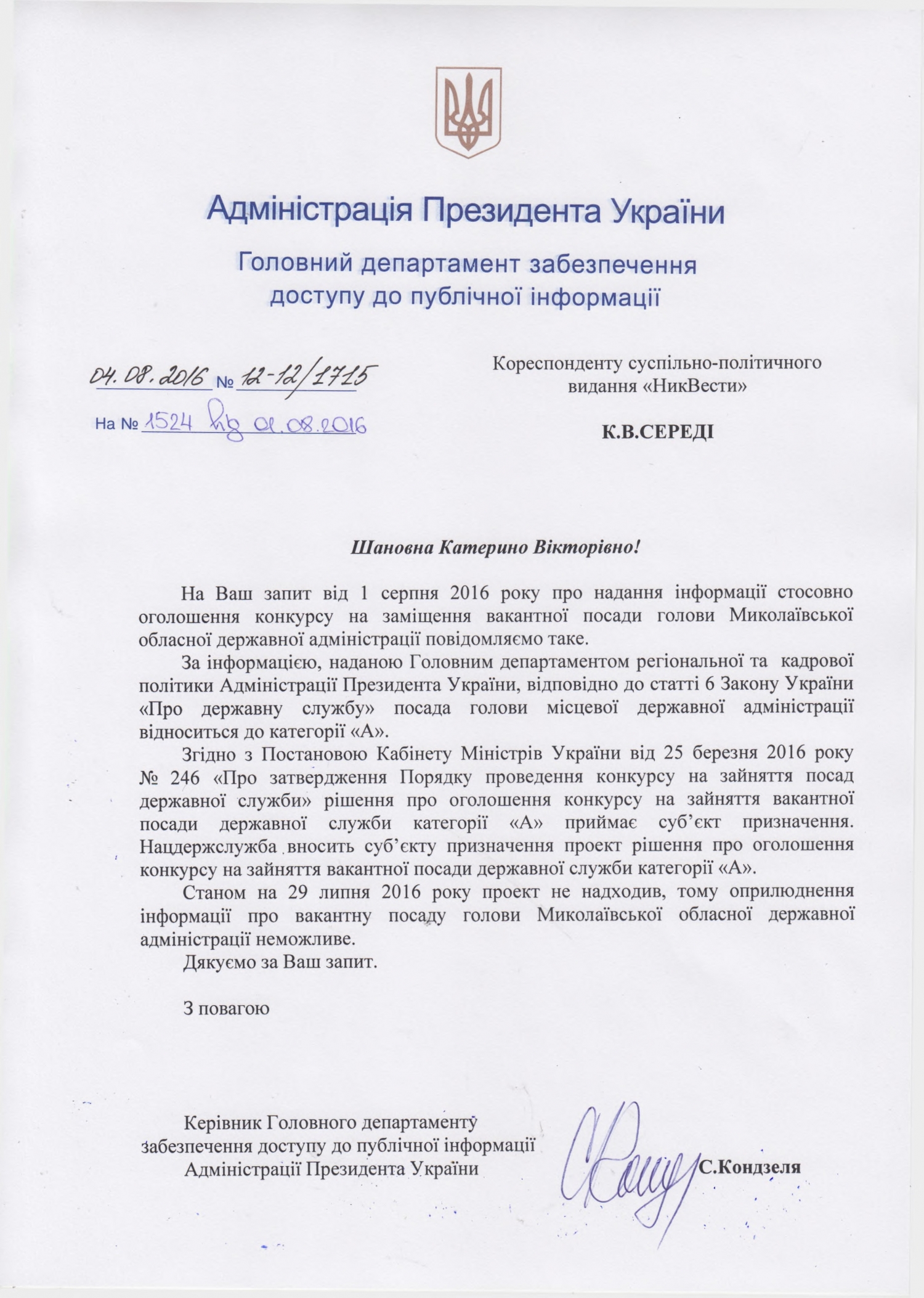 – Нацгосслужба вносит субъекту назначения проект решения об объявлении конкурса на занятие вакантной должности государственной службы категории «А». Состоянием на 29 июля 2016 года проект не поступал, – говорится в ответе на запрос НикВестей.