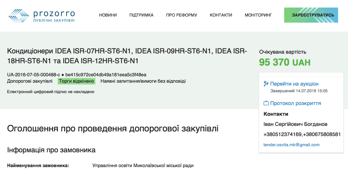 Свои предложения для участия в закупке подали две компании: ЧП «Доном» и ООО «Приватэнрего», которые предложили соответственно 86 786 тысяч гривен и 88 462 за кондиционеры. В итоге, 14 июля победителем закупки товаров через систему электронных торгов ProZorro было определено ЧП «Доном» (директор Оксана Киц).