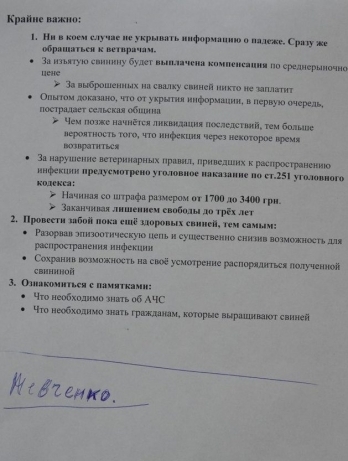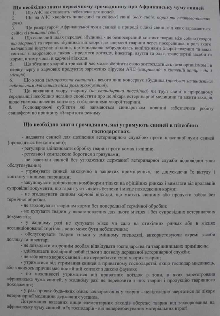 — Прошу донести информацию населению о том, что нельзя скрывать информацию о падеже – сразу обращайтесь к ветеринарным врачам. Ведь за изъятую свинину по рыночной цене в обязательном порядке будет выплачена компенсация. За свиней, о смерти которых утаили, которых выбросили на свалку, никто компенсацию не получит. Также любой из них отвечает по статье 251 Уголовного кодекса, может быть штраф до 3400 гривен или лишения свободы до 3 лет, - подчеркнул Вячеслав Бонь.