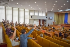 Первым делом был сформирован президиум собрания, председателем стал Юрий Пидвишинский, секретарем Вадим Дзугань. Решения принимались простым большинством, но не от числа зарегистрированных, а от числа присутствующих в зале. Т.е. иногда для принятия решения хватало и 25 голосов «За».