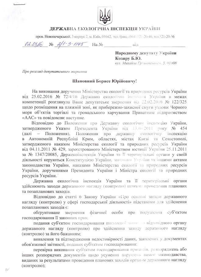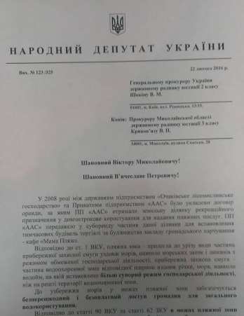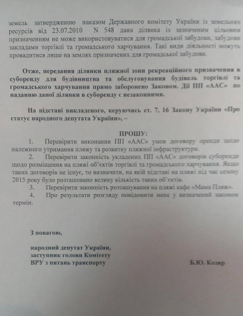 – Чиновники упорно не хотят замечать фактов грубых нарушений арендатором – частным предприятием «ААС» - условий договора аренды, незаконного размещения на пляжах объектов торговли и общественного питания, что прямо запрещено статьей 90 Водного кодекса Украины и статьей 62 Земельного кодекса Украины, – заявил нардеп.