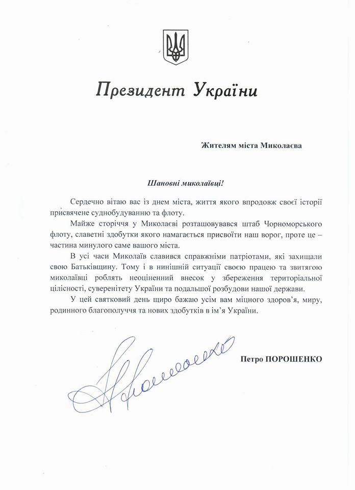 Президент Украины Петр Порошенко поздравил жителей Николаева с 227-й годовщиной со дня основания города.