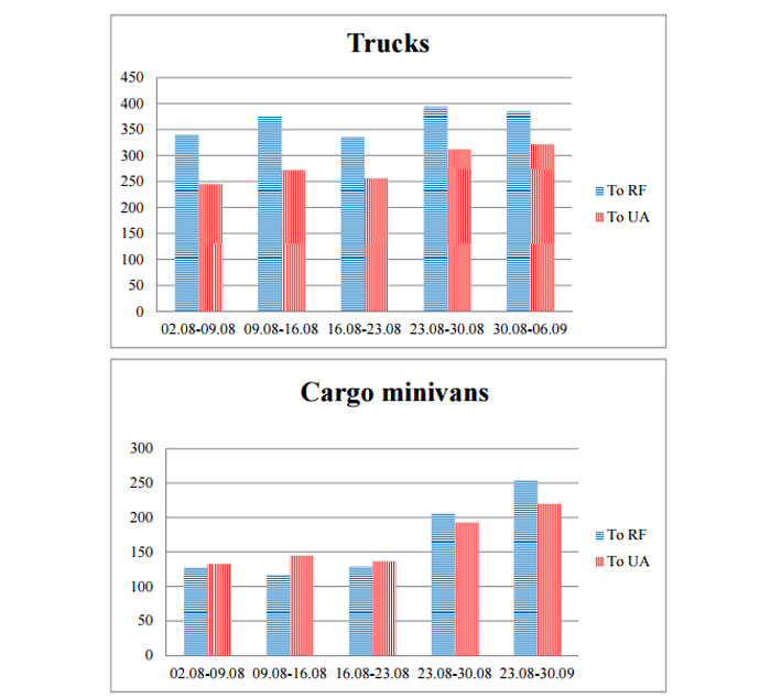Таковы данные наблюдательной миссии ОБСЕ на российских контрольно-пропускных пунктах на границе с Украиной в Гуково и Донецке (РФ) за период со 2 августа по 6 сентября, передает «Украинская правда».
