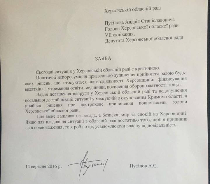 – Для погашения напряженности в Херсонском областном совете и ради недопущения дальнейшей дестабилизации ситуации в граничащей с оккупированным Крымом области, я принял решение досрочно сложить с себя полномочия председателя Херсонского областного совета, – говорится в заявлении Путилова.