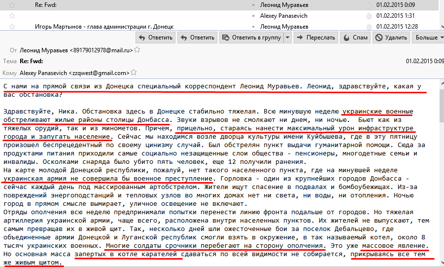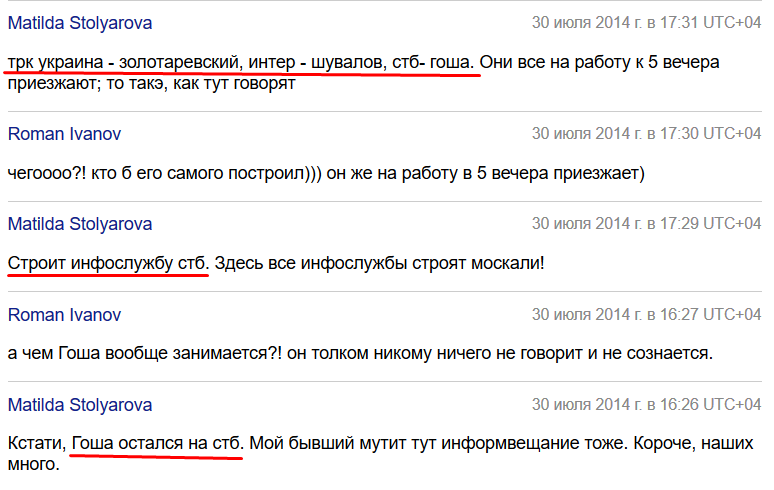 Ранее в интернет попала переписка сотрудницы «министерства государственной безопасности ДНР» Татьяны Егоровой с российским журналистом Леонидом Муравьевым, сотрудниками телеканалов «Интер» и «Донбасс» (основан ТРК «Украина»).