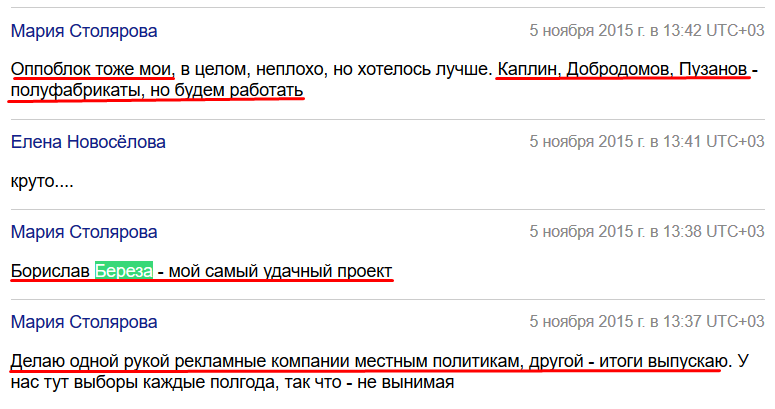 – Сценарии сюжетов сочетают в себе кремлевские тезисы («Украина должна немедленно прекратить войну, которую начали лидеры Евромайдана»), безграничный экономический популизм и голословные обвинения в коррупции. Кроме того, переписка демонстрирует тесное сотрудничество Столяровой с проектами «Народный контроль» Дмитрия Добродомова, «Партией простых людей» Сергея Каплина, «Партией решительных граждан» Борислава Березы. А также с функционерами «Опоблока» (в частности, советником Левочкина россиянином Игорем Шуваловым). Из переписки понятно, что избирательные ролики Каплина, Добродомова и «Опоблока» делали именно эти русские-украинофобы, – заявил Вадим Пидберезняк.