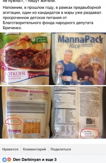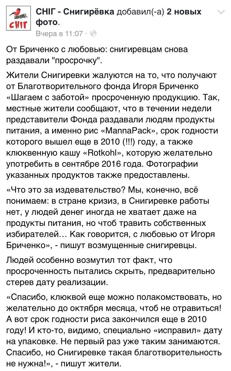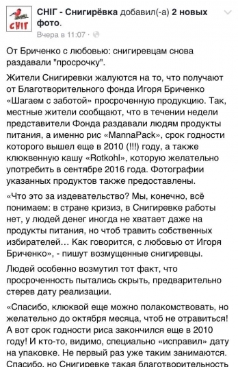 – Информация, распространенная в СМИ, о предоставлении продуктовых комплектов с истекшим сроком годности социально незащищенным слоям населения, является неправдивой. На фото, которые опубликовала «Снигиревская Народная Internet Газета», затерта дата, а в новости сказано, что срок истек. Предоставлен комментарий якобы от человека, получившего продуктовый набор, но не было названо имя «пострадавшего». Это подтверждает, что представленная информация является попыткой дискредитации деятельности фонда «Шагаем с заботой» и меня как народного депутата Украины, – считает Игорь Бриченко.