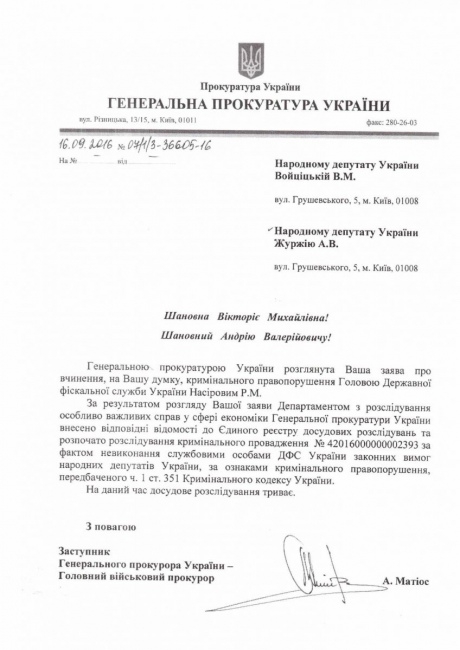 Как сообщалось, 21 апреля 2016 г. Национальное антикоррупционное бюро открыло уголовное производство в отношении должностных лиц ГФС за служебную подделку официальных документов. А в конце мая НАБУ завело дело в отношении главы Государственной фискальной службы Романа Насирова по фактам, касающимся ПАО "Укрнафта".