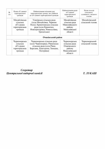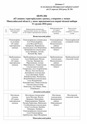 Речь идет о выборах в депутатов и глав советов (мэров) Александровской поселковой объединенной территориальной общины, Прибужановской сельской объединенной территориальной общины Вознесенского района, Мостовской сельской объединенной территориальной общины Доманевского района, Михайлоской сельской объединенной территориальной общины Николаевского района и Черноморской сельской объединенной территориальной общины Очаковского района Николаевской области.