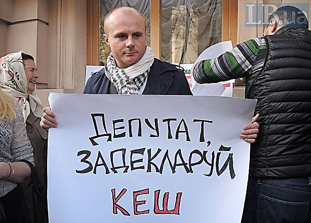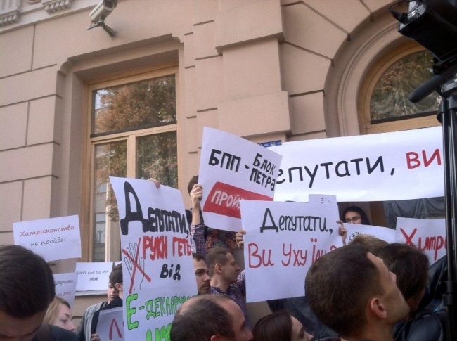 Пикетчики требуют не регистрировать законопроект главы фракции БПП Игоря Грынива, которым предлагается закрыть информацию об имуществе и подарках чиновников.