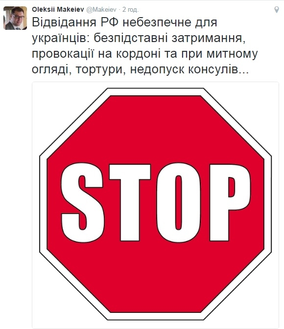 — Посещение РФ опасно для украинцев: безосновательные задержания, провокации на границе и при таможенном досмотре, пытки, недопуск консулов, - написал Алексей Макеев.