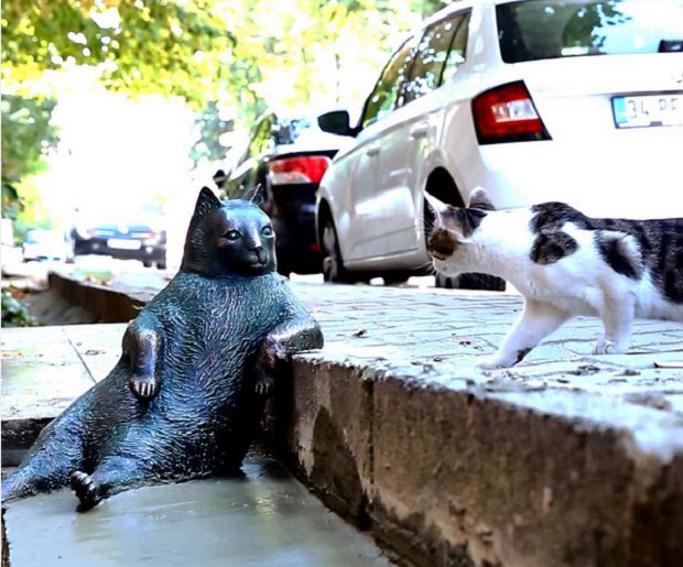 В Стамбуле установили памятник местной "знаменитости" - коту Томбили, который любил задумчиво сидеть у бордюра возле оживленной трассы, опираясь одной лапой на бордюр.