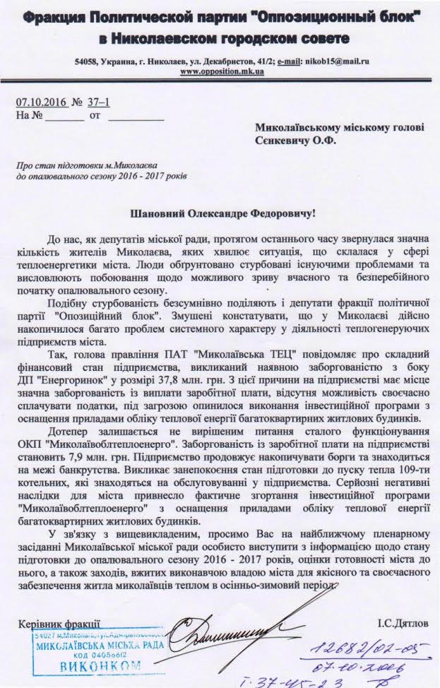 Фракция «Оппозиционный блок» в Николаевском городском совете официально обратилась к мэру Александру Сенкевичу с тем, чтобы он на сессии городского совета проинформировал общество о том, как обстоят дела с подготовкой к отопительному сезону.