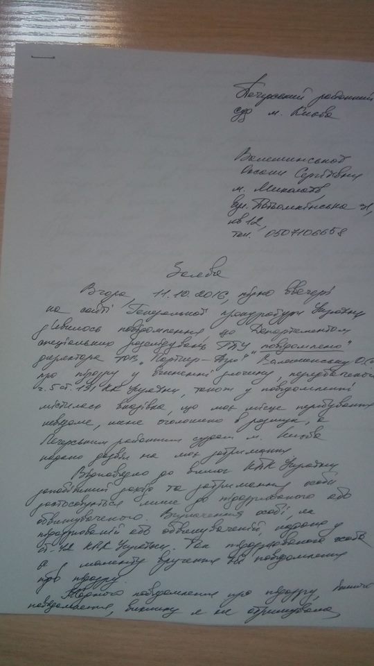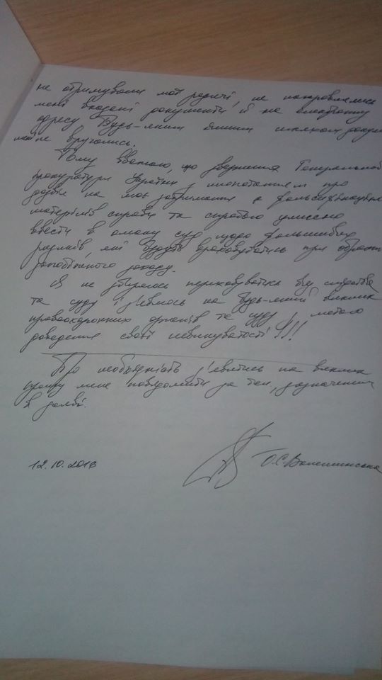 - Приехала в Печерский суд для выяснения обстоятельств "разрешения на задержание", которое якобы было предоставлено судьей Светланой Бабенко. Очень удивила этим визитом судью и ее помощника, которые видимо не ожидали, что я буду "скрываться от следствия" в Печерском суде. К сожалению, мне не дали возможности ознакомиться с материалами дела до вечера, видимо, это дело еще в ненадлежащем виде и его не хотят никому показывать. Сдала заявление в канцелярию суда, надеюсь, что к концу дня увижу материалы дела, - написала она.