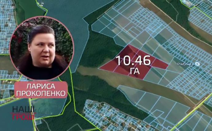 Лариса Прокопенко, сестра "бриллиантового прокурора" Александра Корнийца, обладает более 10 гектарами земли в селе Малютянка под Киевом, которые были отчуждены из коммунальной собственности КП "Киевзеленстрой" через подставных лиц.
