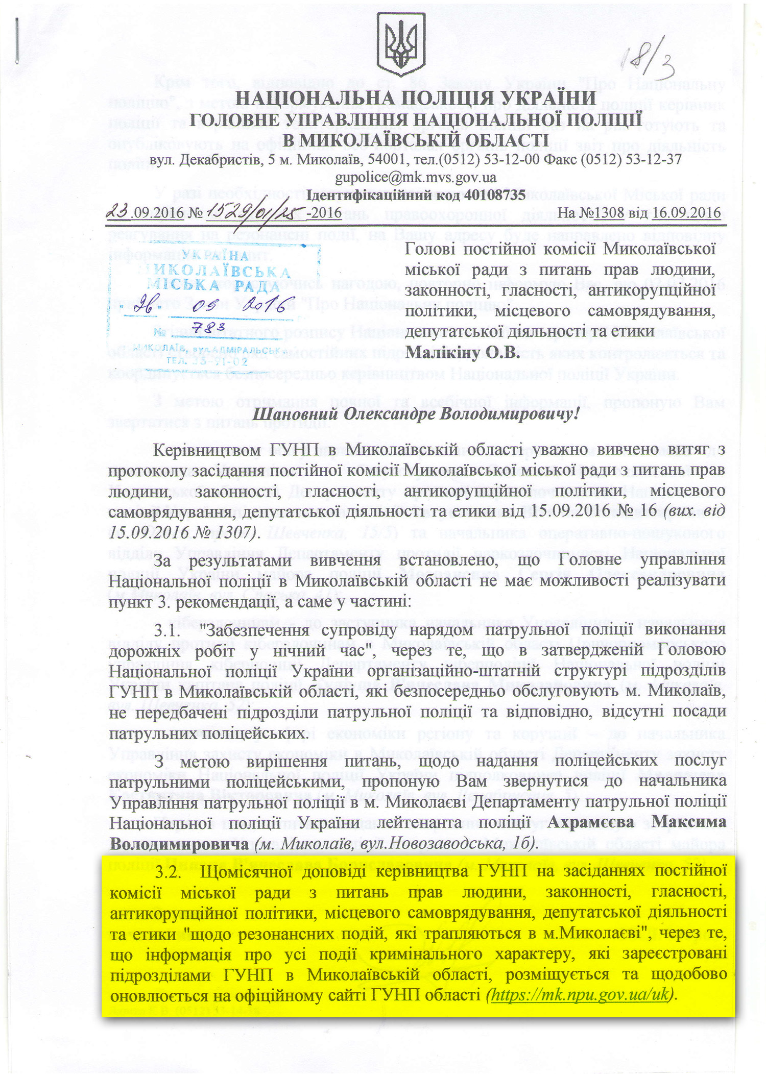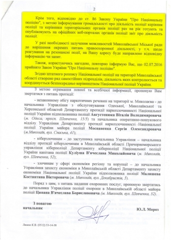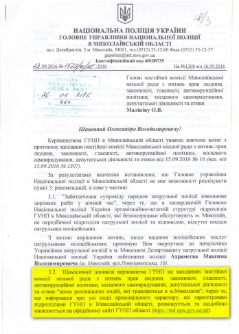 Начальник управления Национальной полиции Украины в Николаевской области Юрий Мороз в ответ на рекомендацию депутатов предложил им читать официальный сайт полиции. Он также добавил, что согласно законодательства для информирования граждан руководство полиции один раз в год готовит отчет, также публикуемый на сайте.
