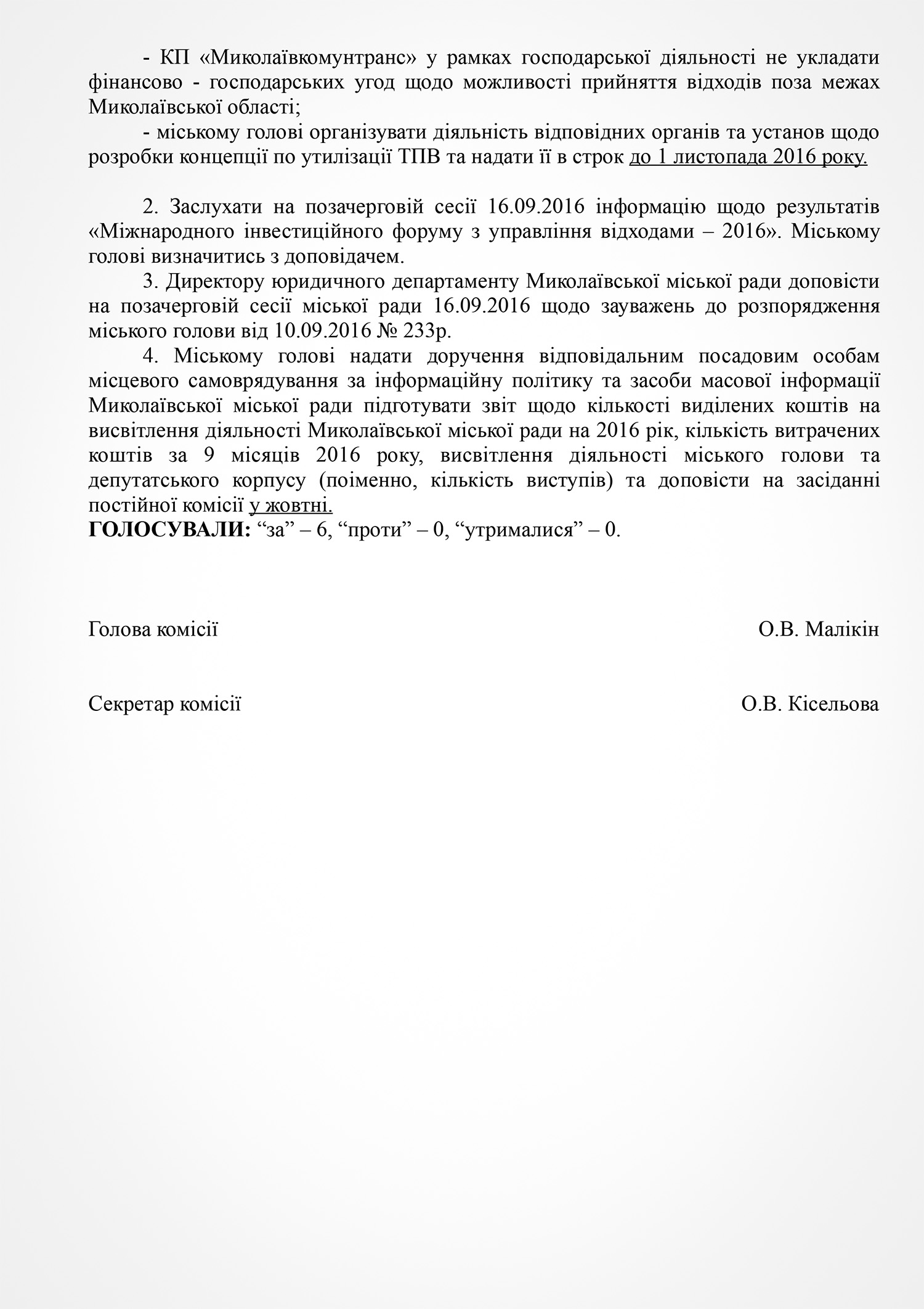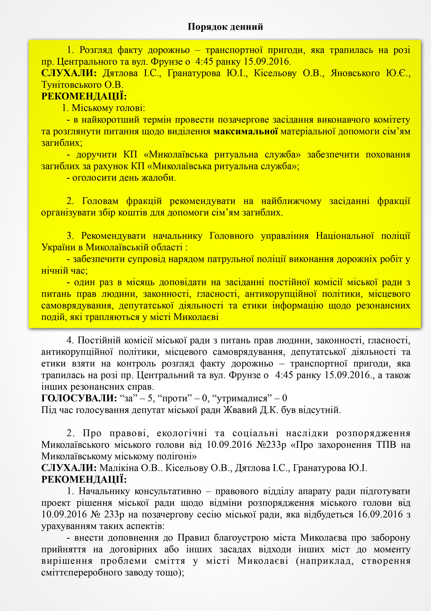 По итогам обсуждения депутаты единогласно приняли решение рекомендовать начальнику Главного управления Национальной полиции Украины в Николаевской области обеспечить сопровождение нарядом патрульной полиции выполнение всех дорожных работ в ночное время.