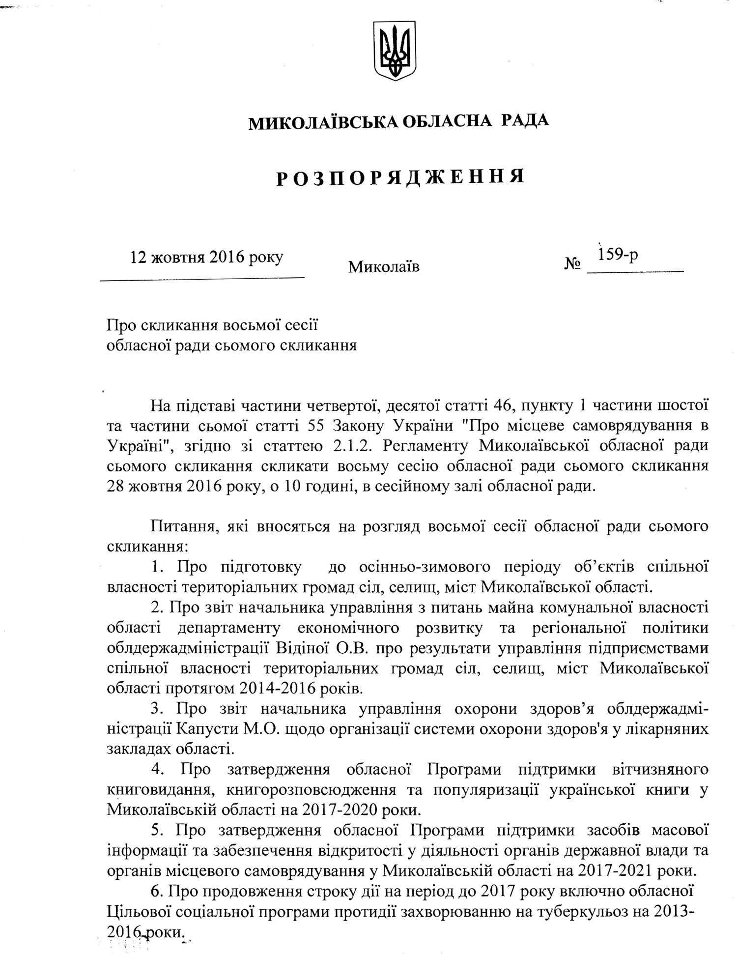 Соответствующее распоряжение было подписано главой облсовета Викторией Москаленко 12 октября.