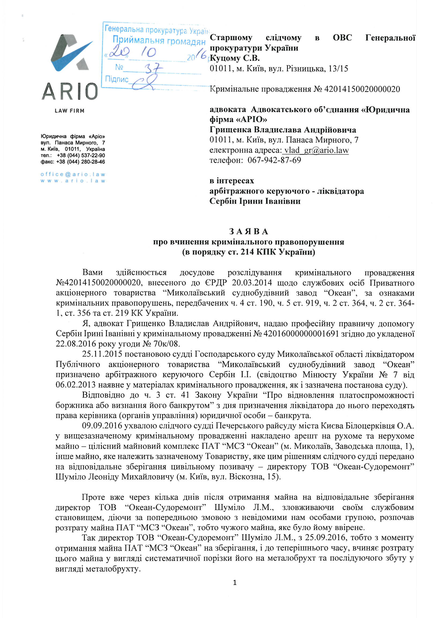 Соответствующее заявление про совершение уголовного преступления в интересах ликвидатора ПАО «НСЗ «Океан» в Генеральную прокуратуру отправил адвокат Ирины Сербин Владислав Грищенко. Копия заявления имеется в распоряжении НикВестей.